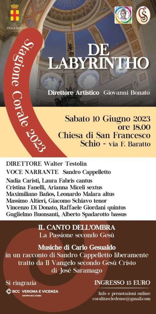 Il 10 giugno nella Chiesa di San Francesco a Schio (VI) e l’11 giugno 2023 nella Basilica di San Calimero a Milano, De labyrintho canterà un nuovo programma: Il Canto dell’Ombra – Gesualdo e Saramago. I Responsori di Carlo Gesualdo raccontati da Sandro Cappelletto per il Festival dell’Ascensione.